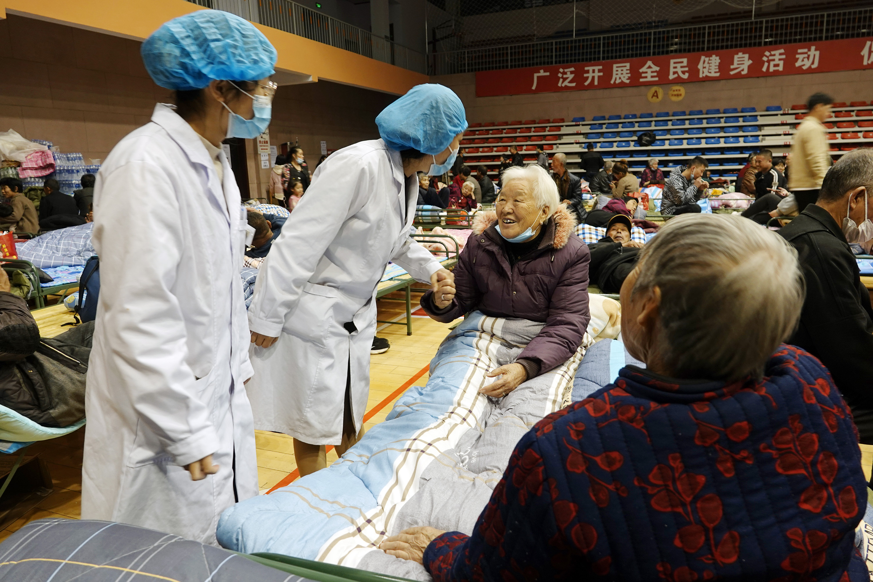 10月8日,在運(yùn)城市新絳縣體育館安置點(diǎn),兩名值守醫(yī)護(hù)人員(左)了解洪峰受災(zāi)群眾身體健康情況。高新生攝
