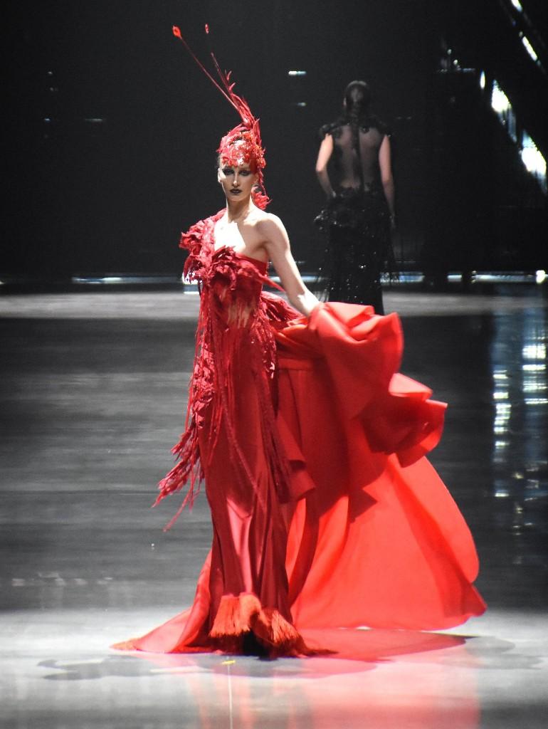 現(xiàn)場燈光緩緩暗下,模特們身著以黑色系為主調(diào)的禮服,邁著優(yōu)雅的步伐依次登場。就在觀眾沉浸于這一片黑色浪漫之中時(shí),最后一位模特身著一襲紅色禮服,宛如黑暗中突然綻放的熾熱火焰,在一眾黑色禮服的映襯下,緩緩走來,瞬間驚艷全場,引得掌聲雷動(dòng)。