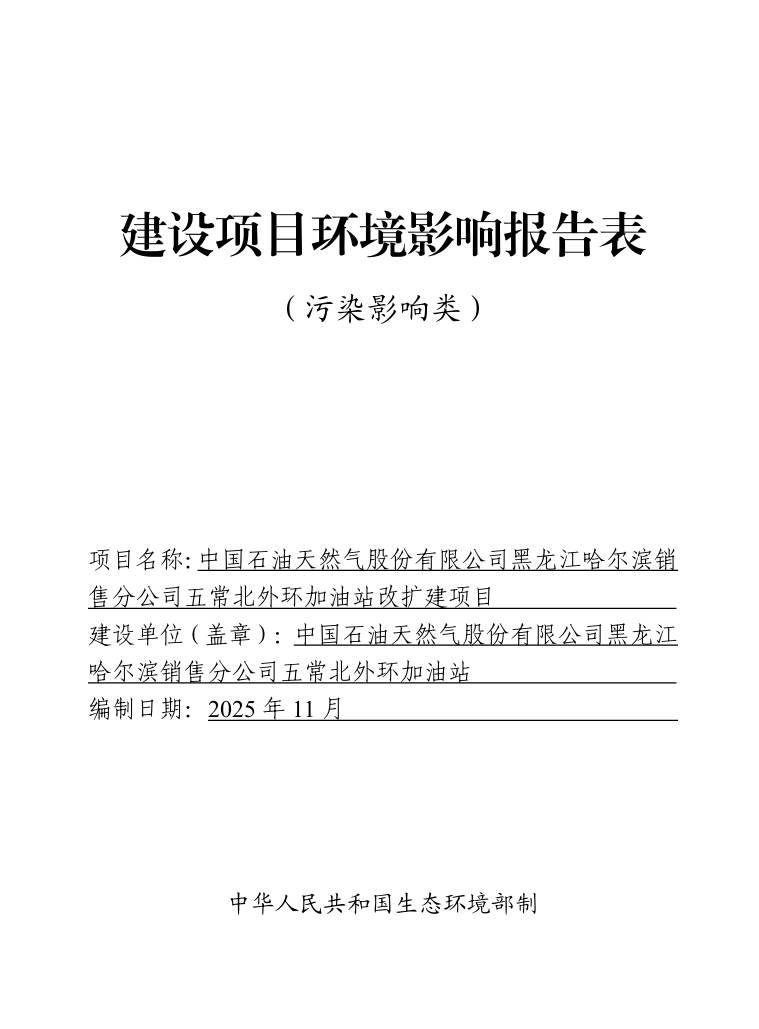 中國石油天然氣股份有限公司黑龍江哈爾濱銷售分公司五常北外環(huán)加油站改擴(kuò)建項(xiàng)目環(huán)境影響報(bào)告表